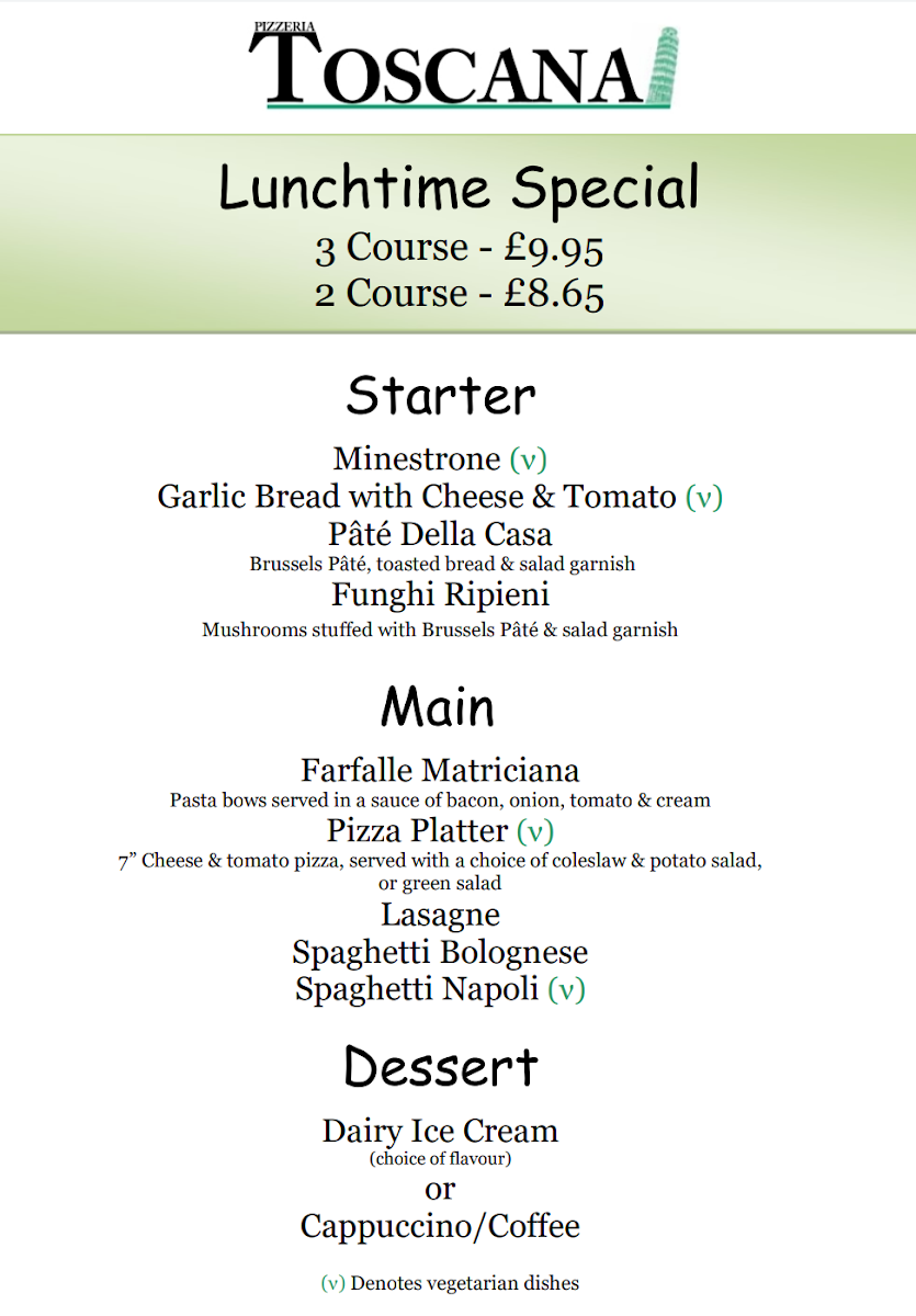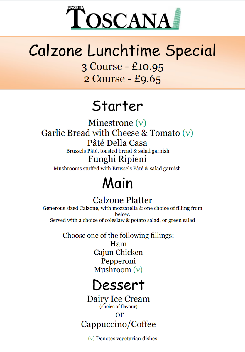 The Pizzeria Toscana Menu features an impressive selection of classic Italian pizzas, each crafted with high-quality ingredients. The dough is perfectly thin and crisp, providing the ideal base for a variety of toppings. Among the standout options is the Margherita, with its rich tomato sauce, creamy mozzarella, and a sprinkle of fresh basil, offering a simple yet satisfying flavor profile. For those looking for something with a bit more flair, the Diavola pizza, topped with spicy salami and a touch of chili, is a must-try for spice lovers.